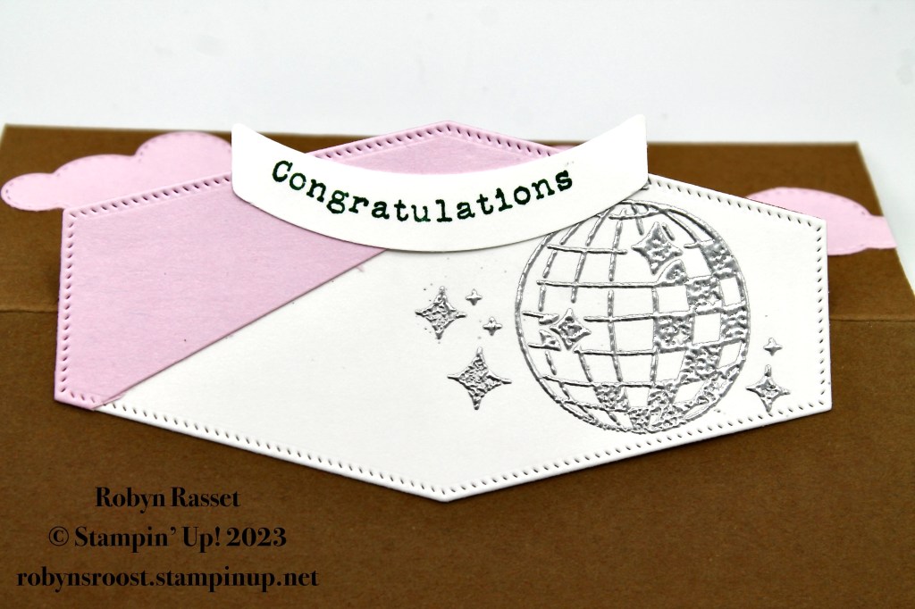The Nested Essentials Dies were used to do the partial die cut on the Z Fold as well as cutting 2 white pieces to stamp on and the 2 partial cuts, one in Bubble Bath pink and the other in Basic Black. The cool Disco Ball is embossed with Silver Embossing Powder.