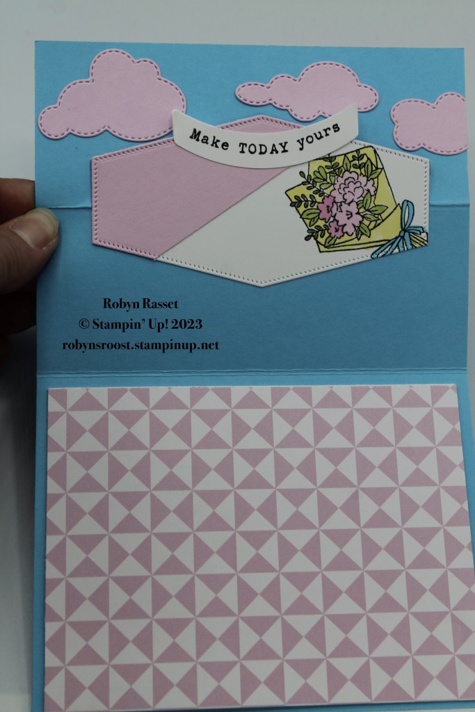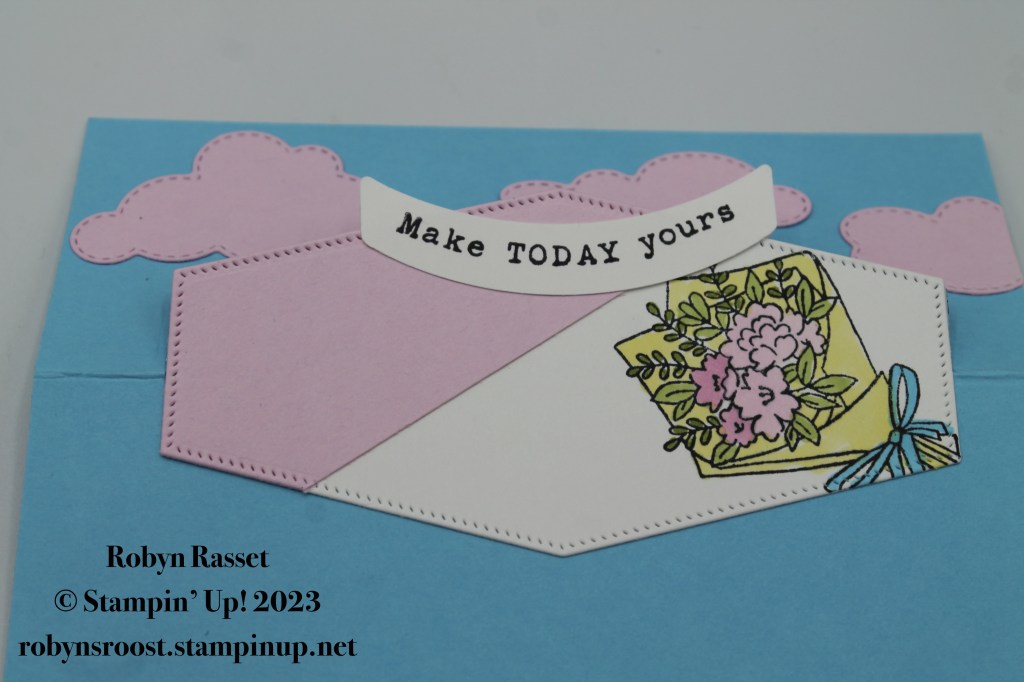 The clouds are from the Give It A Whirl Die set and are done in Bubble Bath. The pretty patterned paper is from the Delightfully Eclectic DSP pack.