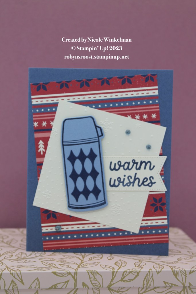 Today’s card is perfect for the weather! I just came inside and it’s howling and cold, like the beginning of a winter storm. What could be better than a cup of warm cocoa from an old fashioned thermos?