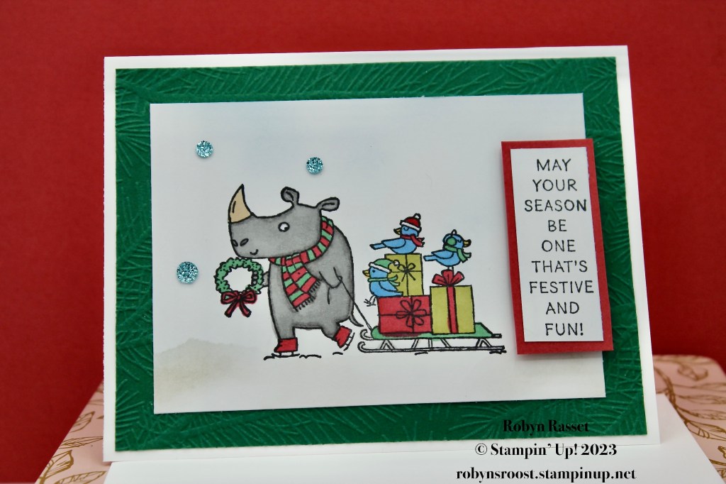 The cute critters in the Festive & Fun stamp set are sure to make anyone smile. I’ve added some subtle sponging on the background to create snow piles and snow. The Shaded Spruce matte layer is embossed with the Pine Boughs Embossing Folder to add some texture and then some sparkly gems for shine.