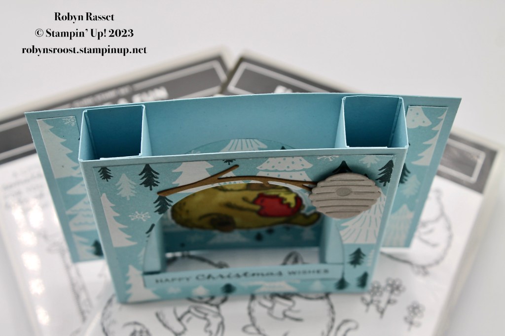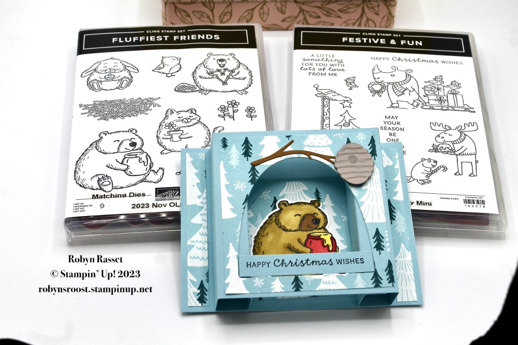 There aren’t any greetings in the Fluffiest Friends stamp set, so I pulled in a greeting from the Festive & Fun set. Sort of a gathering of critters hehehehe. The patterned paper used on this card is from the awesome Walk in the Forest pack. Not only is it fun to use but for each pack purchased $3 is donated to Toys for Tots, so it gives me a warm and fuzzy feeling to use too.