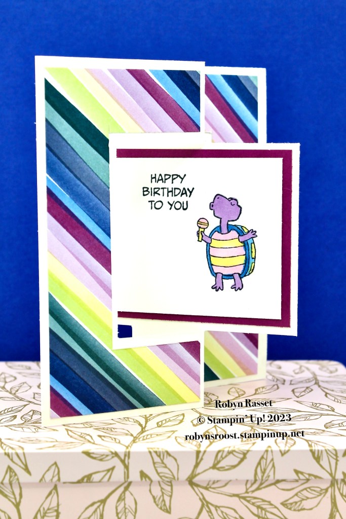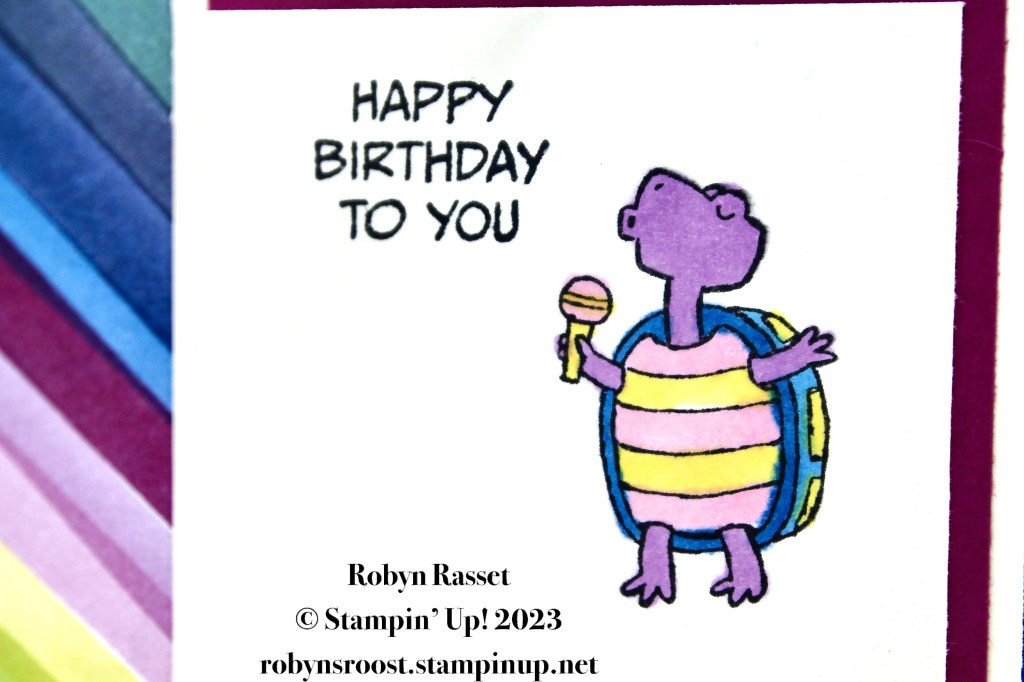 My silly turtle is colored with Stampin’ Blend Markers (also on Sale today $8.50 per set of 2 instead of $10). I used the colors from the paper Azure Afternoon, Lost Lagoon, Lemon Lolly, Bubble Bath and Fresh Freesia.