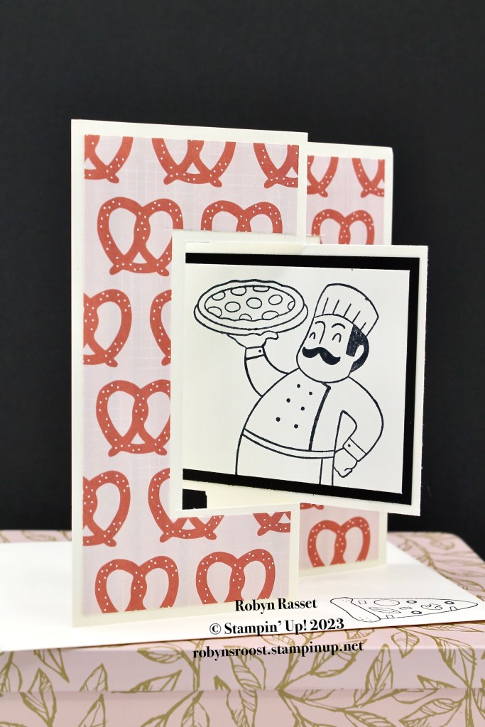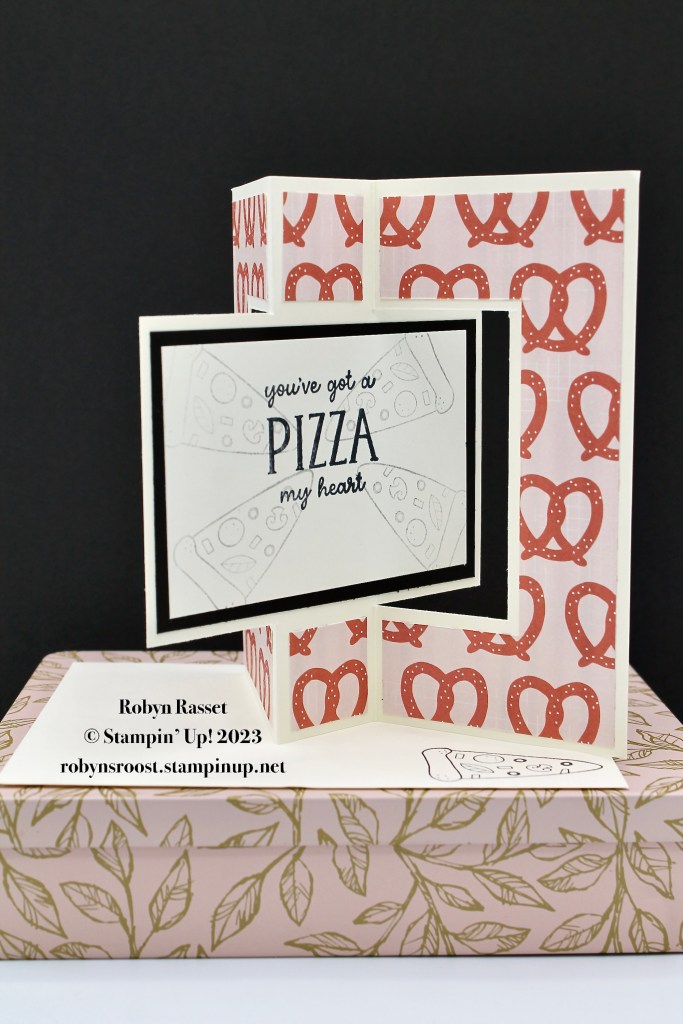 Here I’ve combined another pattern of the Delightfully Eclectic DSP with the humorous Supremely Awesome stamp set for a fun love, or Valentine card. I went simple with no coloring. For the inside, I inked the pizza slices with Smoky Slate and stamped off on my grid paper before stamping over the greeting.
