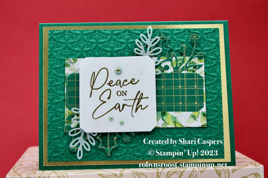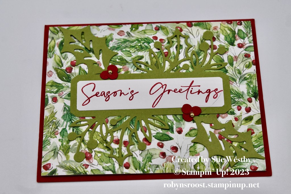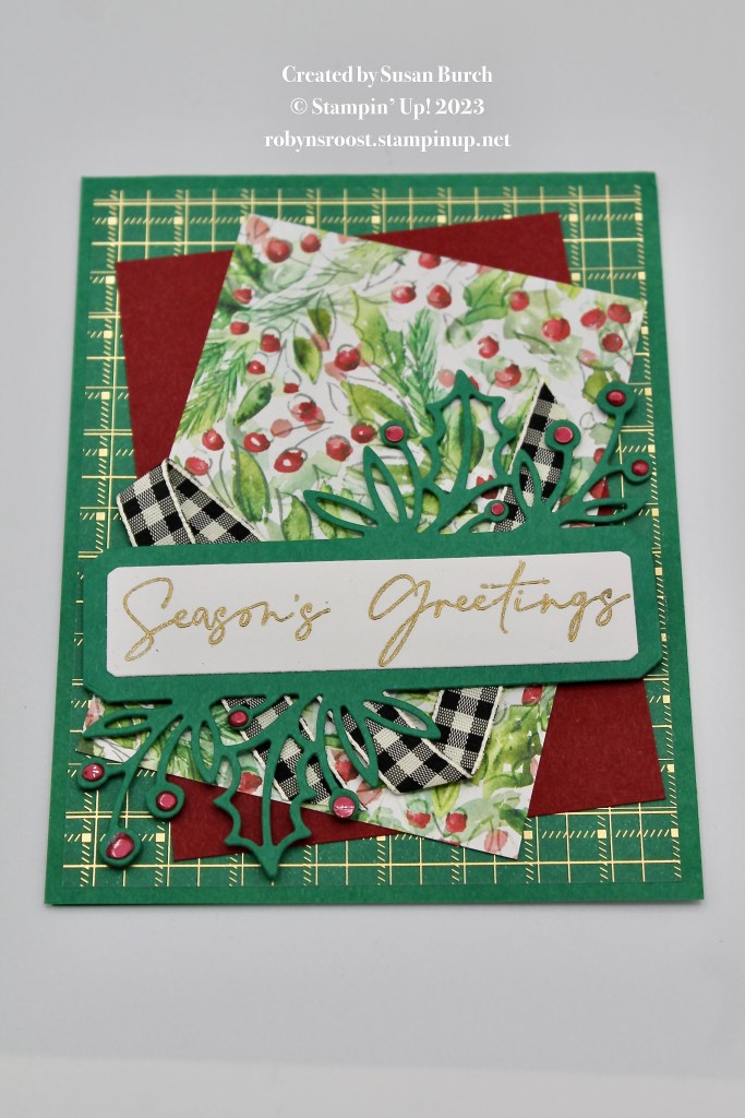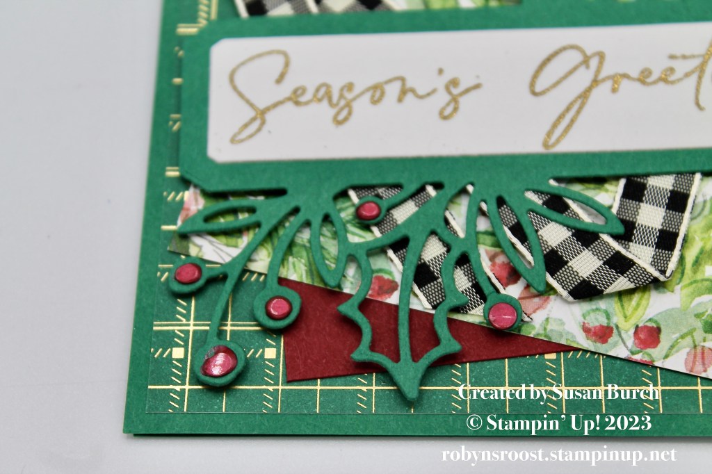 Sue’s card uses the Christmas Classics Bundle from the Joy of Christmas Suite. The greeting dies in this set are so cool! I love the cut out leaves around the label. This card is definitely a classic. I could see this one being great for an assembly line of Christmas cards. Cut a stack of papers, die cut the labels and mass produce.