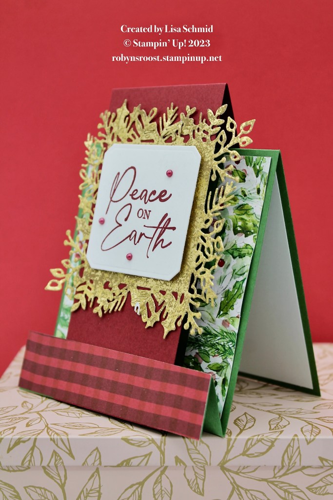 Here on Lisa’s card you see another of the pretty die cuts from the Christmas Classics Bundle. Done in Gold Glimmer paper is really makes this fun Step Card shine.