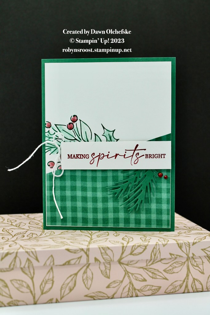 There are two stamp sets in the Joy of Christmas Suite and this card is the only one I have using the Joy of Noel Bundle. I love the white space and how clean this card looks. Classic Dawn O! Dawn is the person who convinced me to join her Stampin’ Up! team. I’ve always been jealous of how straight she gets everything, lol. My cards are always a bit more slap-dash. The checkered paper is from the Joy of Christmas Designer Series Paper which is part of the Suite and the red gems are also part of the Suite and are the Loose Holly Gems & Sequins.