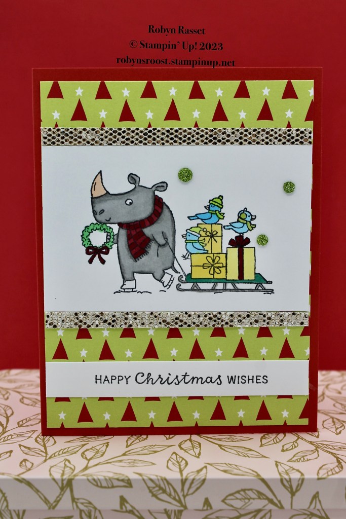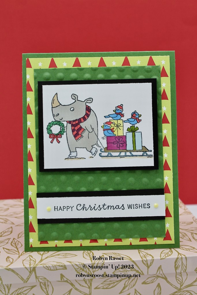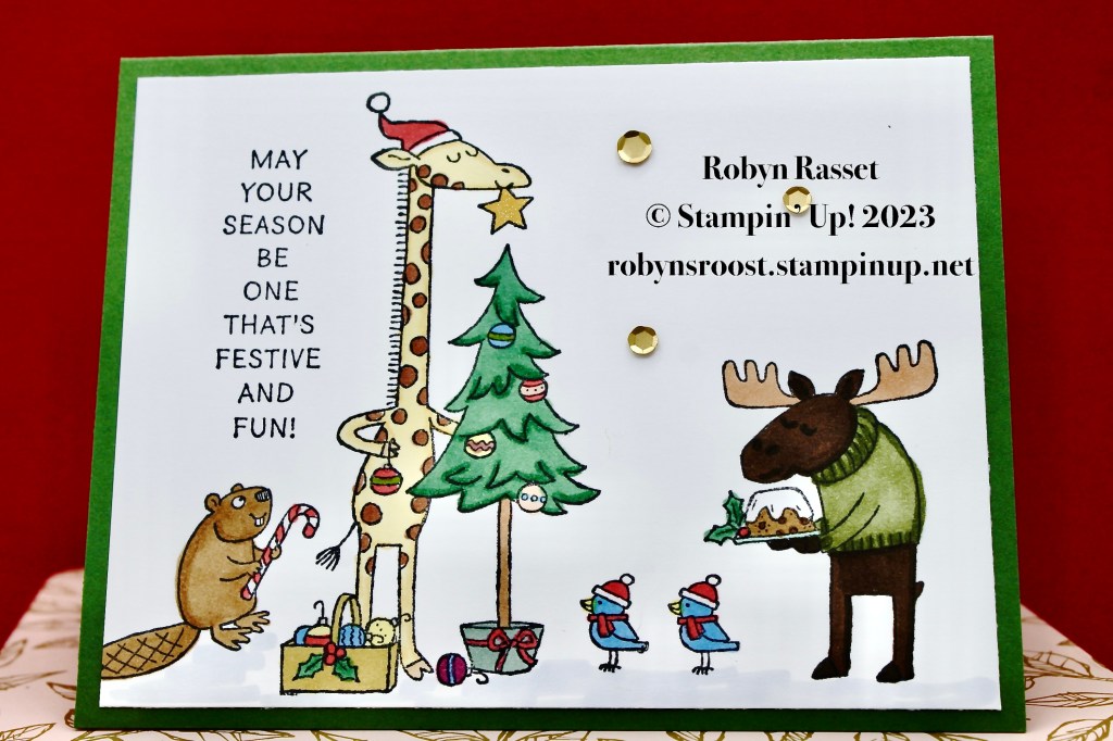 I didn’t use any dies for my cards today. The critters are all colored with Stampin’ Blend Markers. This was my favorite and I made a bunch of this design experimenting with different colors. I like the Lemon Lolly and Pecan Pie combo for the giraffe best, which is what this card uses. Each card also has one item that has been brushed with Wink of Stella. The shinny gold star at the top of the tree on this one.