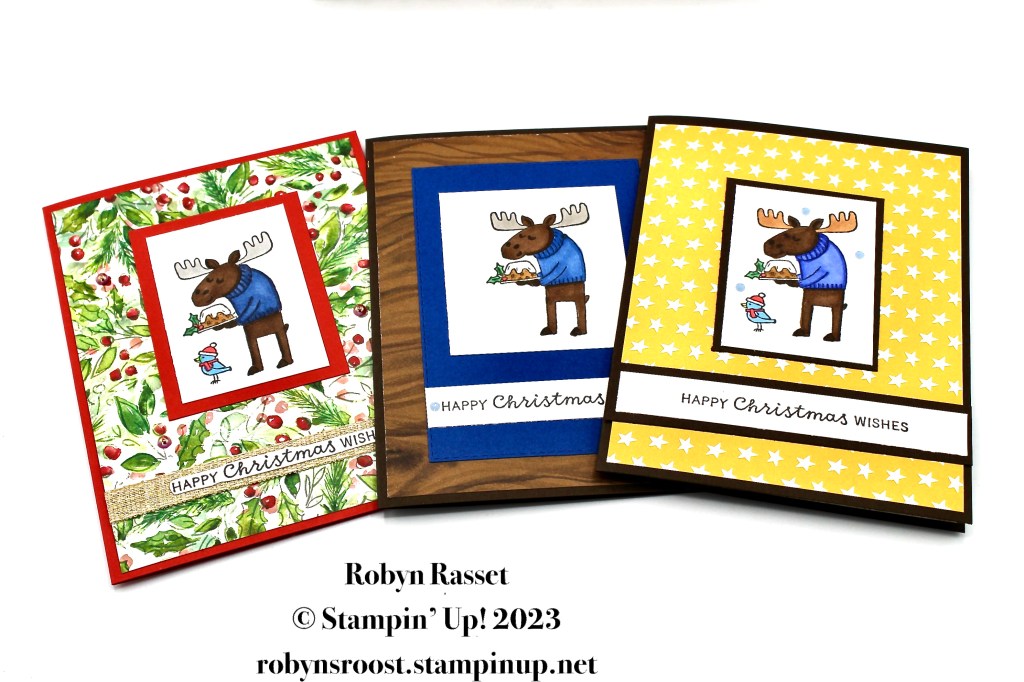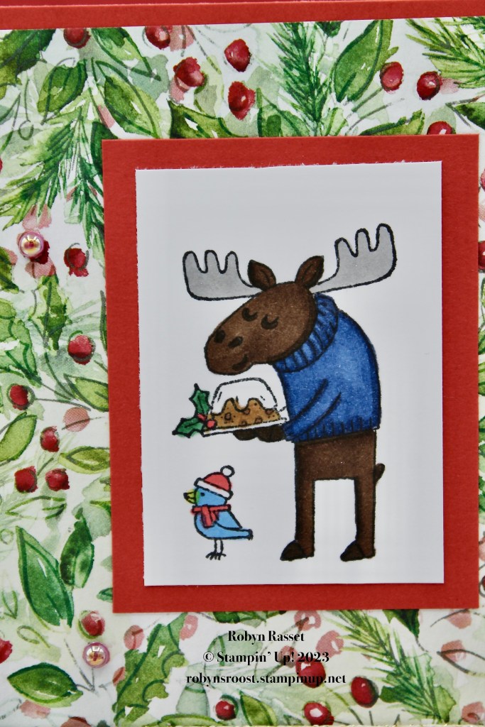 For this trio of moose I pulled in some ribbon, Joy of Christmas DSP and Merry, Bold & Bright DSP. Lately there have been moose sightings in my area. This is a bit uncommon for central Minnesota. I grew up in northern Minnesota where moose were a common site, and a hazard to keep in mind when driving.