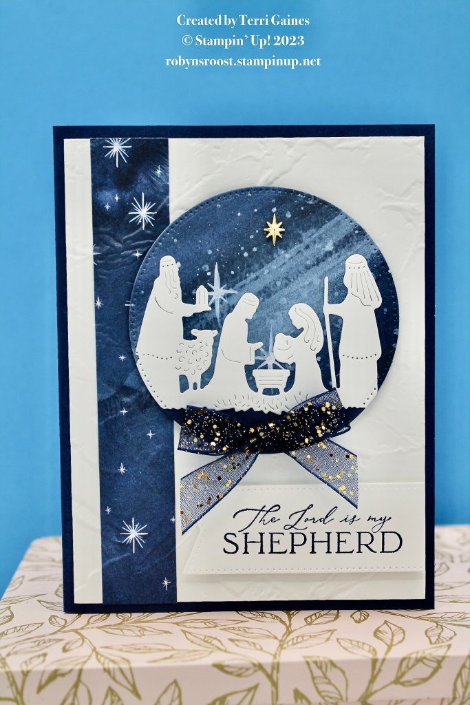 I wanted to show you ways to make a CASE card work when you don’t have the same products. I didn’t have the O Holy Night Designer Series Paper so I substituted some retired paper that I had, named Brightly Gleaming. I also didn’t have the pretty ribbon so substituted the Misty Moonlight Inner Braid Ribbon.