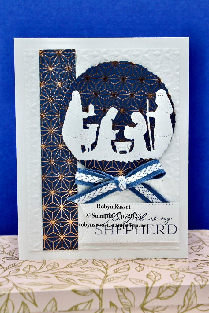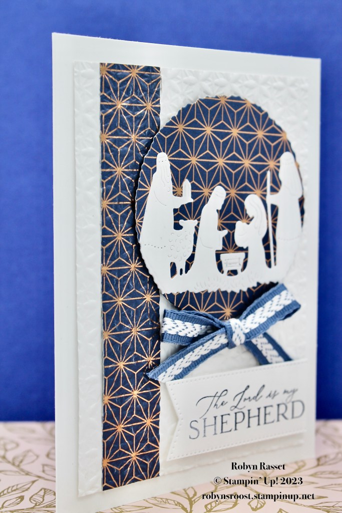 The DSP strip on was adhered to the white matte first and then both were run through the embossing folder. This is called Embedded Embossing. I used one of the Basics 3D folders, Terri used the Painted Textures Embossing Folder. The labels are cut with one of the Stylish Shapes Dies and then the one end is snipped off. The nativity scene is adhered a 3″ square of the DSP and then die cut with a Deckled Circles Die. Both the main image and the greeting are popped up with dimensionals.