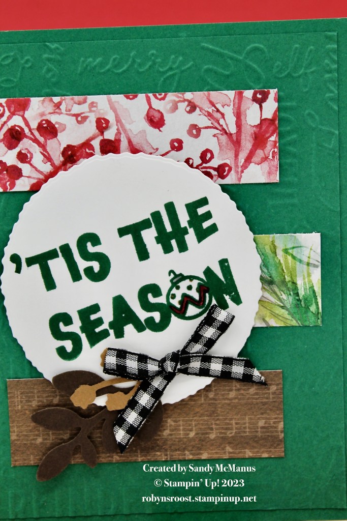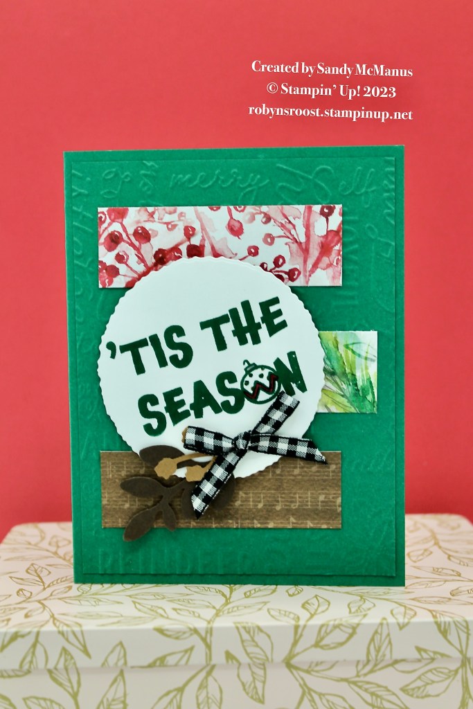 Sandy’s card features the Jolly Words stamp set and Christmas Tiding Embossing Folder with patterned paper strips from the Joy of Christmas DSP.