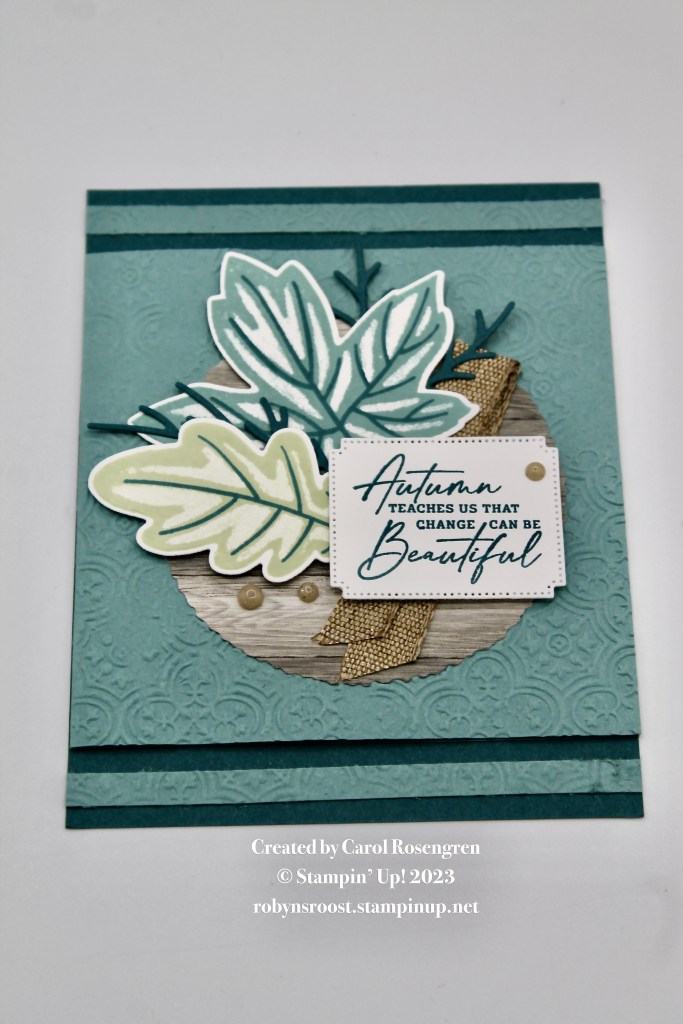 Carol uses lots of items from the suite; Autumn Leaves stamp set and dies, All About Autumn paper, Speckled Dots Embellishments, Distressed Tile Embossing Folder, and Natural Ribbon from the Copper and Natural Ribbon Combo pack.