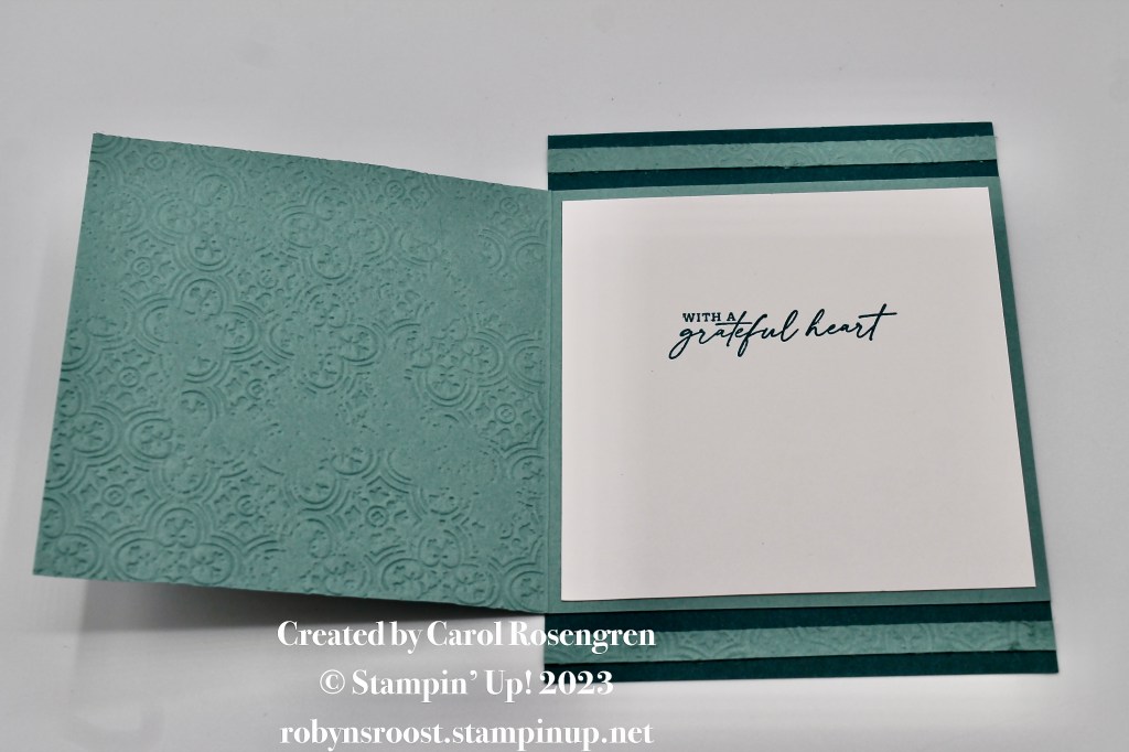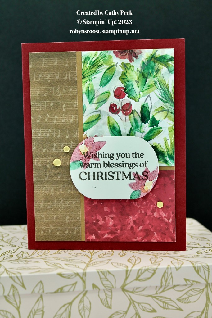 Cathy’s card features the Modern Garden Bundle. The rounded corner Modern Oval Punch is part of this bundle. I like the clever way that Cathy has mounted the Joy of Christmas DSP pieces onto a 3 3/4″ x 5″ piece of Pecan Pie cardstock, leaving a strip of the cardstock showing between the Joy of Christmas pieces. Here are the DSP sizes if you would like to recreate this look: Music Notes 1 1/4″ x 5″, Greenery 2 3/8″ x 3″ and Red 2 3/8″ x 1 7/8″