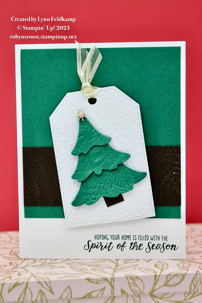 Lynn’s card uses the Merriest Trees Bundle with lots of texture created with Fern and Snowflake Sky embossing folders. The Merriest Trees Die set even has a die to create this tag!