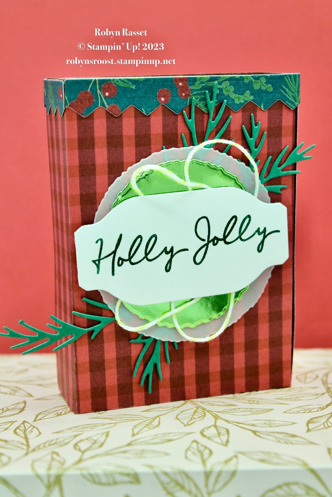 This box is full sized with holes die cut in the top for a handle. The paper is the Snowflake Magic Specialty DSP. The greeting is from the Merry & Bright stamp set done in Shaded Spruce ink. The labels are die cut with the Something Fancy Dies. A piece of vellum is layered under and has been die cut with the Deckled Circles Dies. A sprig was cut from the Christmas Pines Die and some 2022-2024 In Color Bakers Twine was looped around under the greeting.