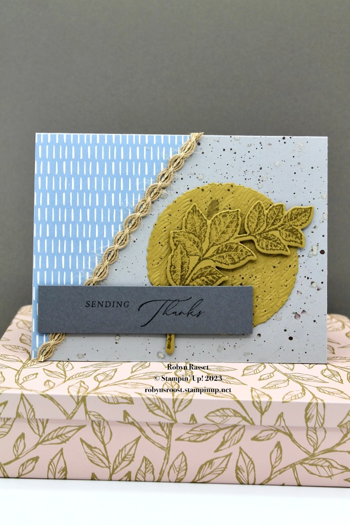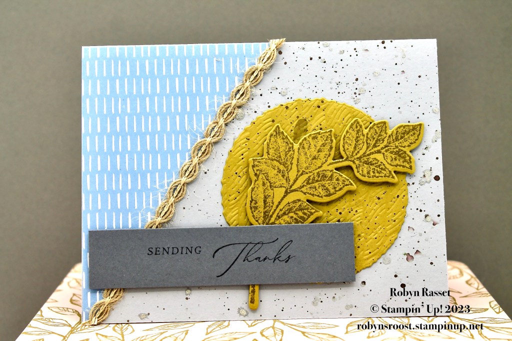 My card base is Smoky Slate with a Wild Wheat circle die cut with the Deckled Circles Dies and embossed with the Rope Embossing Folder. The Stippled Rose leaf sprig is stamped with Wild Wheat then die cut with the Stippled Rose dies. I splattered Wink of Stella glitter and then Pebbled Path ink over the card base. The greeting that I used from the Stippled Rose dies was actually stacked instead of in a line, so I masked off the words to make them into a single line.