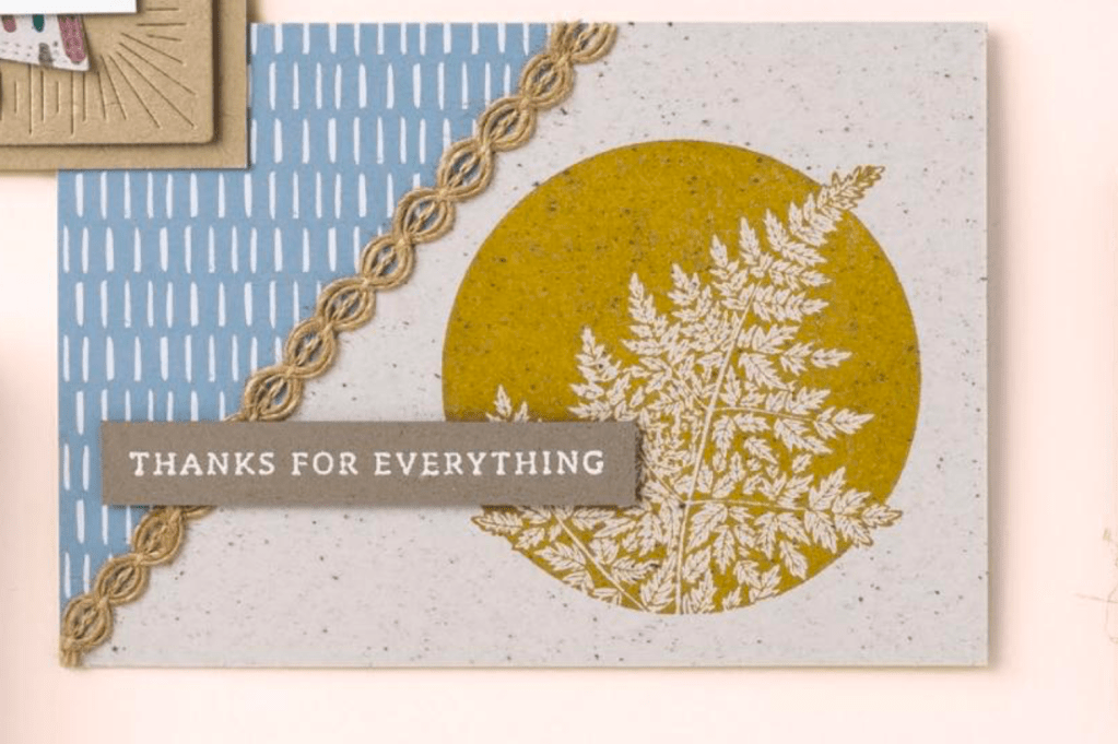 This new stamp set is called Stippled Rose. I’ve just used the leaf stamp and matching die, just wait until you see the large rose! I found this card layout on page 106 of the Annual Catalog using the Marvelous Nature stamp set.