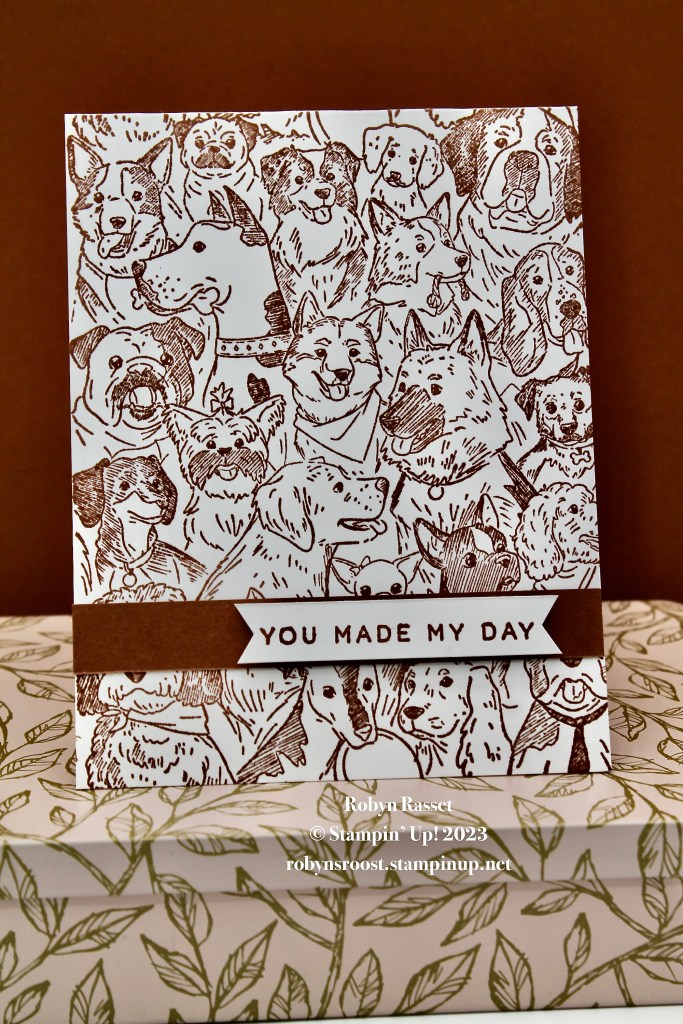 I’ve used the Cheerful Daisies stamp for the greeting, just like the original card, BUT instead of using designer series paper for the base, I’ve used a new background stamp from the upcoming January to April Mini Catalog called Doggone Friendly. I just couldn’t resist!