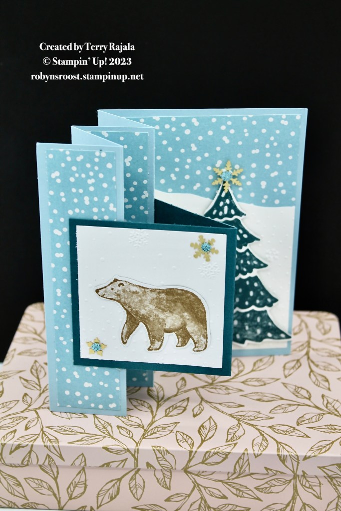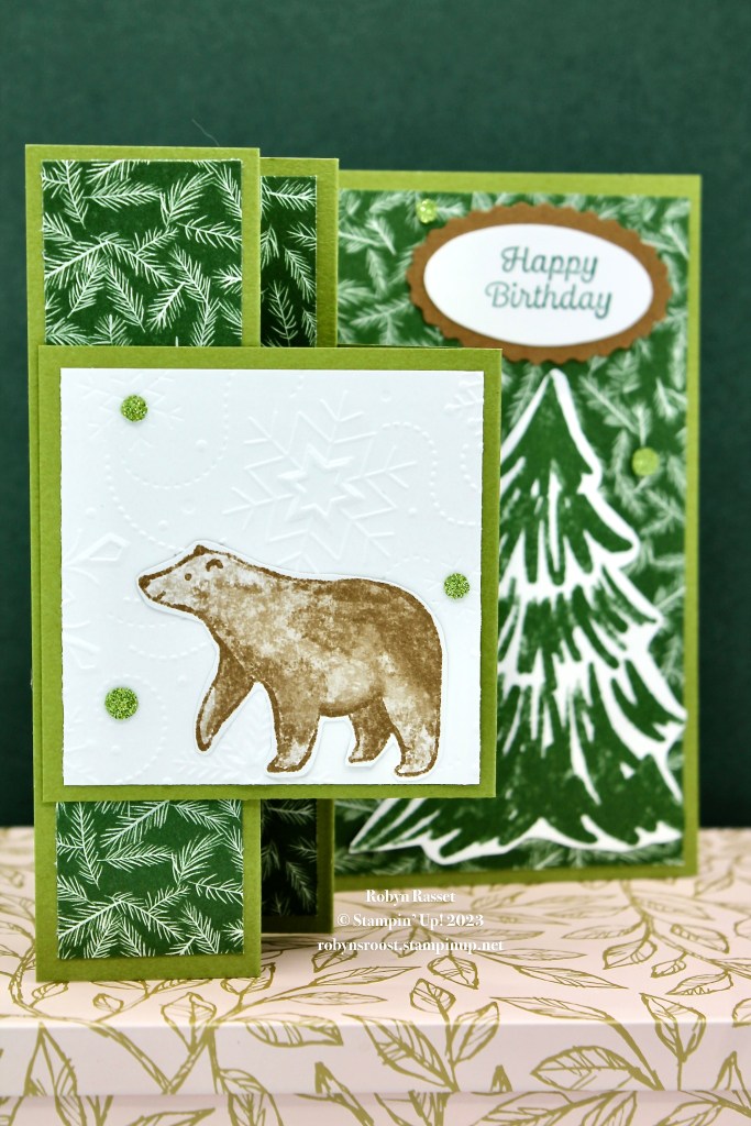 The only stamping on this card is the greetings, which are from the Very Best Occasions stamp set. All of the other elements are fussy cut from the A Walk in the Forest Designer Series Paper. There is a punch that will cut out the bear called the Beary Cute Punch which coordinates with the Beary Christmas Suite.