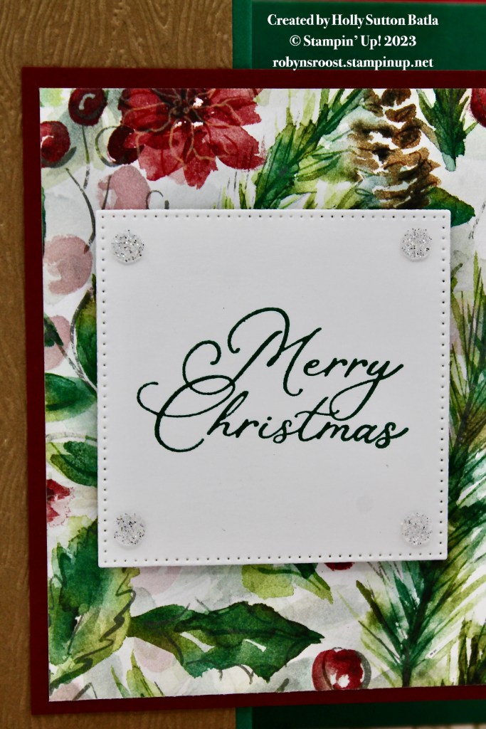 Holly’s card is a Christmas Classic. It features the beautiful Merry Christmas greeting from the Stars at Night stamp se. the greeting sits on a stitched square cut with the Stylish Shapes Dies, adorned with Adhesive Backed Glitter Sequins on each corner. The Pretty patterned paper is from the Joy of Christmas DSP and there is even a strip that is embossed with the Timber 3D Embossing Folder.