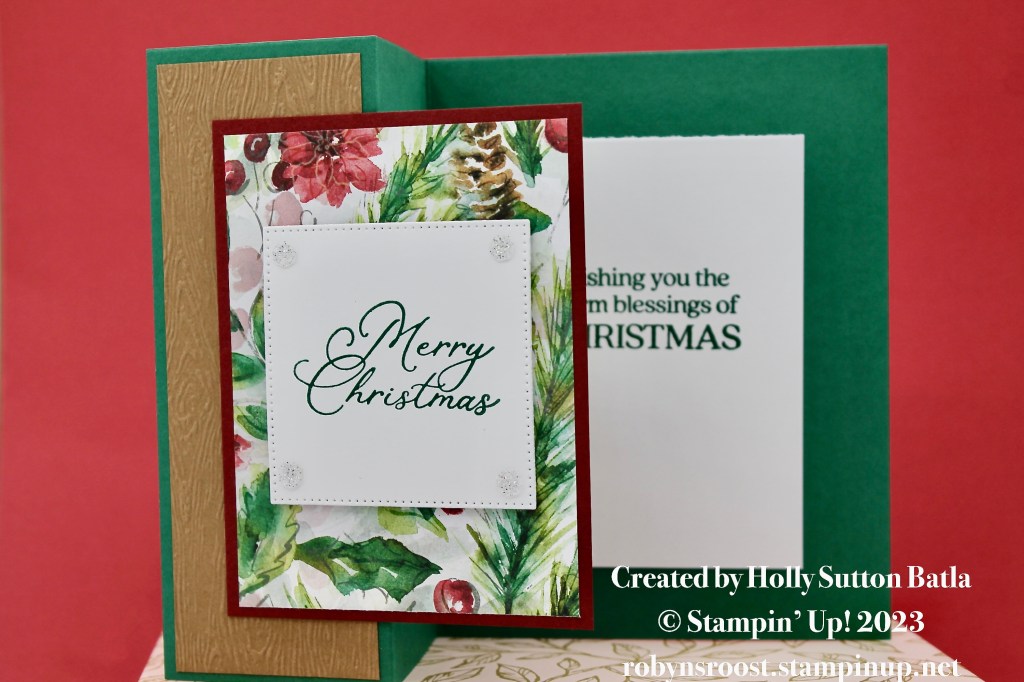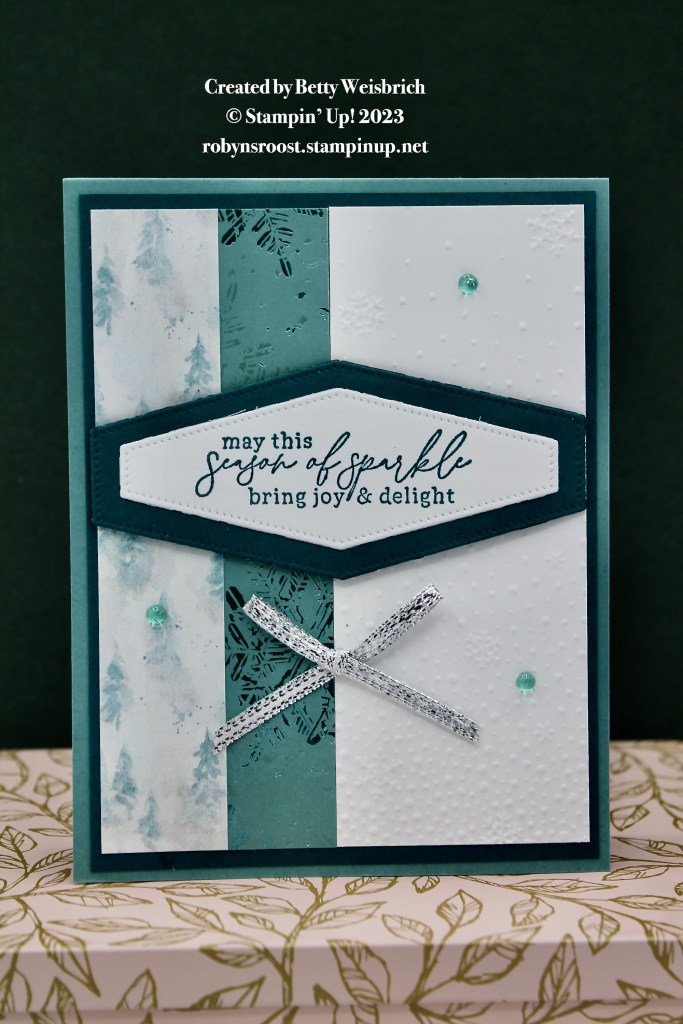 Betty’s card uses the Nested Essentials Dies for an eye catching greeting element. The Snowflake Sky Embossing Folder add texture to the basic white layer. A Winter Meadow DSP strip adds so cool, misty trees and the Snowflake Magic DSP adds some sparkle. The greeting is from the Magical Meadow stamp set. I really love the Pretty Peacock and Lost Lagoon color combo with the white embossed layer.