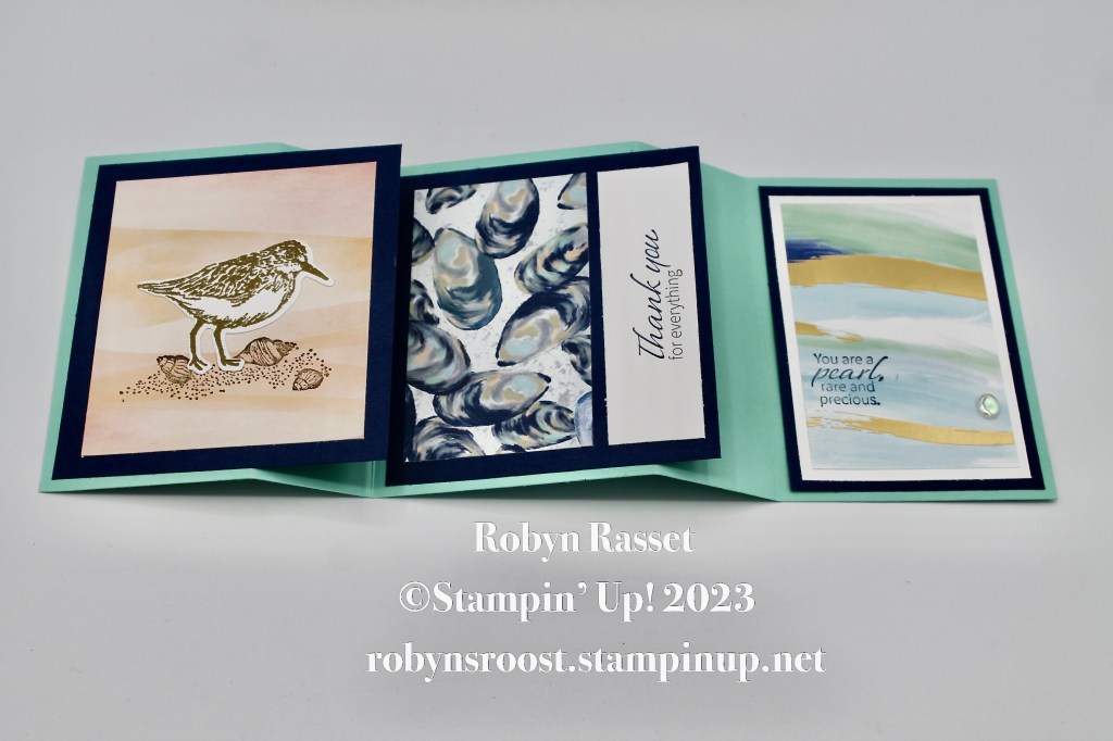By the Bay Designer Series Paper. The awesome Seaside Bay stamp set is still in the Annual Catalog and these two pair up like peanut butter and jelly!
