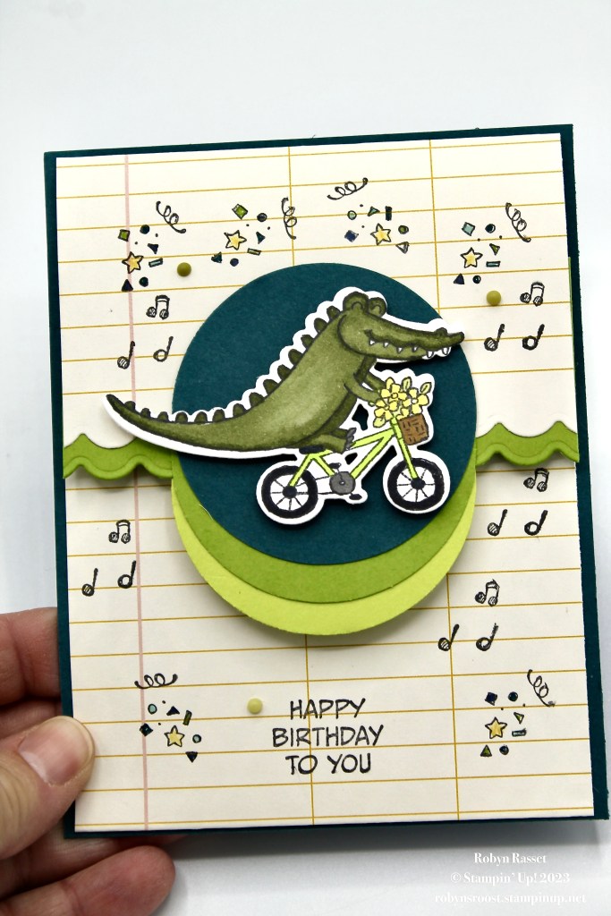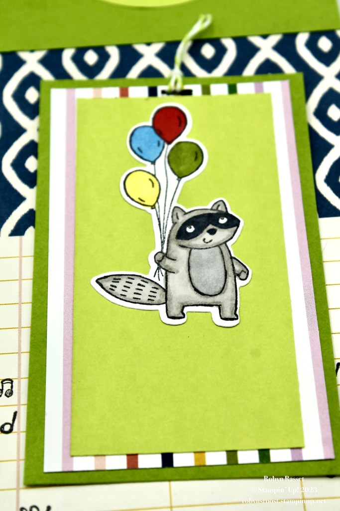 I couldn’t pass up adding this little raccon with some colorful balloons. Both critters were colored with Stampin’ Blend Markers. The striped paper is also from the Delightfully Eclectic DSP stack.