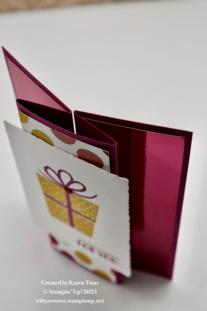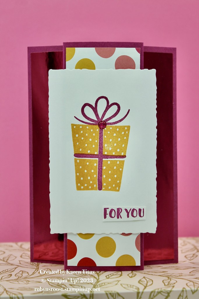 This unique fun fold by Karen Titus uses the Sending Cheer stamp set and Deckled Rectangle Dies. It’s marvelously simple to create! Start with an 8″ x 5 1/2″ base and score at 2″, 3″, 5″, & 6″. Decorate with DSP or foil strips; three that are 1 3/4″ x 5 1/4″ and two that are 3/4″ x 5 1/4″. It folds flat to fit in an envelope and if you want a write on space on the back add another 1 3/4″ strip to the middle section. Then all you need is a focal image to add to the front.