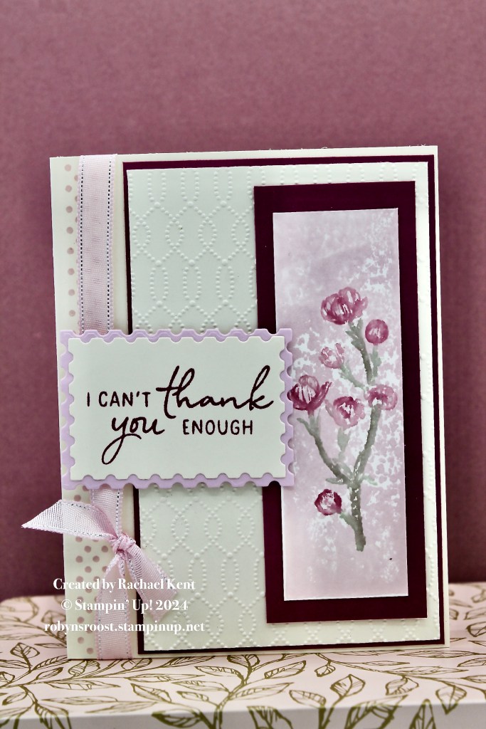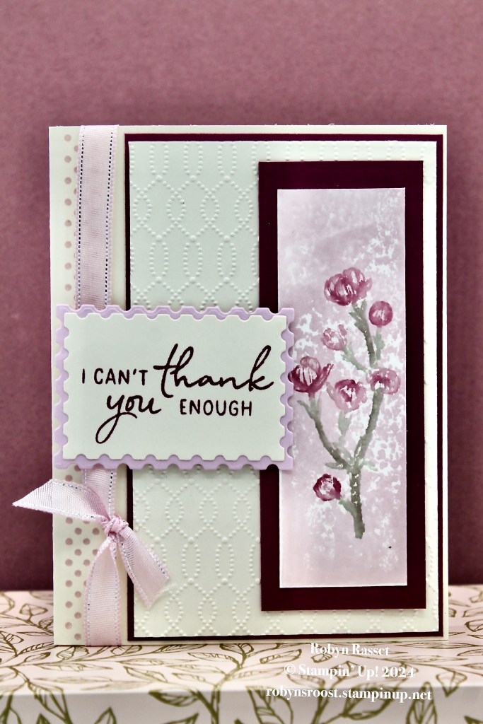 The image is stamped on a 1 3/8″ x 4 1/4″ piece of Basic White cardstock which was colored with a clear block, for a Watercolor effect. The block was inked with Bubble Bath ink and then spritzed with water before applying to the paper. It is mounted on a 1 3/4″ x 4 3/4″ piece of Berry Burst cardstock. Next, is a 3 1/4″ x 5 1/4″layer of Very Vanilla which is embossed with the Softly Sophisticated Embossing Folder (another SAB item). This is layered onto a 3 3/8″ x 5 3/8″ piece of Berry Burst.