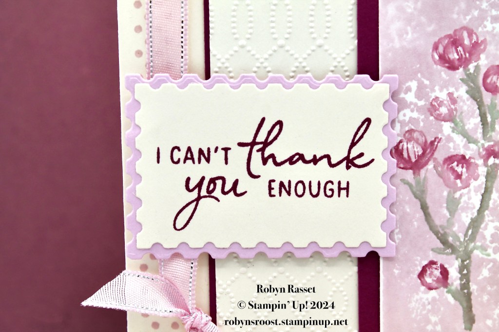 The Detailed Dogwood stamp set is all images so I pulled in a greeting from the Perennial Postage stamp set and die cut it with the coordinating Perennial Postage Dies. The Bubble Bath matte layer was die cut twice. The next larger die from the one that I used of the Very Vanilla greeting was too big. It covered up my flowers. So I simply cut the two edges again to make it smaller. I think it was probably dumb luck that the corners cut as well as they did. The only tip I can give you is to snug the die into the previous cuts to make it match up. When I added the dimensionals, I placed them in the center of the greeting so that the ribbon tucked in under it and the greeting sits level.