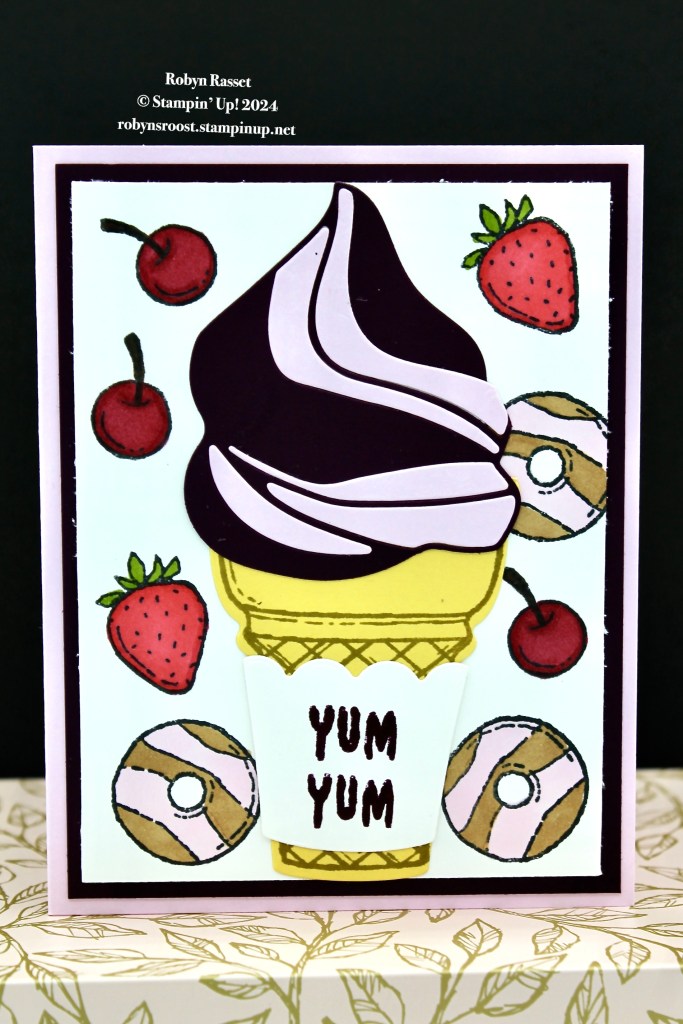 I couldn’t pass up adding some of the cherries, strawberries and donuts to the background. They are colored with Stampin’ Blend Markers. The white holder/sleeve is stamped with the greeting in Blackberry Bliss. This would make a great Valentine for the grandkids with a DQ coupon tucked inside. Stop back tomorrow when I’ll be sharing some awesome swap cards that I received using this cool set.