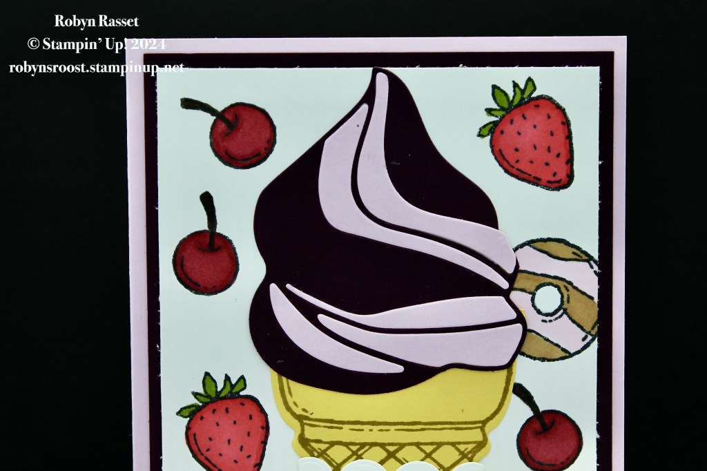 For this card, I’ve die cut the swirl in Blackberry Bliss and again in Bubble Bath and then combined the two by fitting the Bubble Bath swirls into the Blackberry Bliss ice cream for an intarsia or inlay look. The cone is stamped with Crumb Cake ink on Daffodil Delight cardstock. This is my favorite color combo for the cone, so far at least.