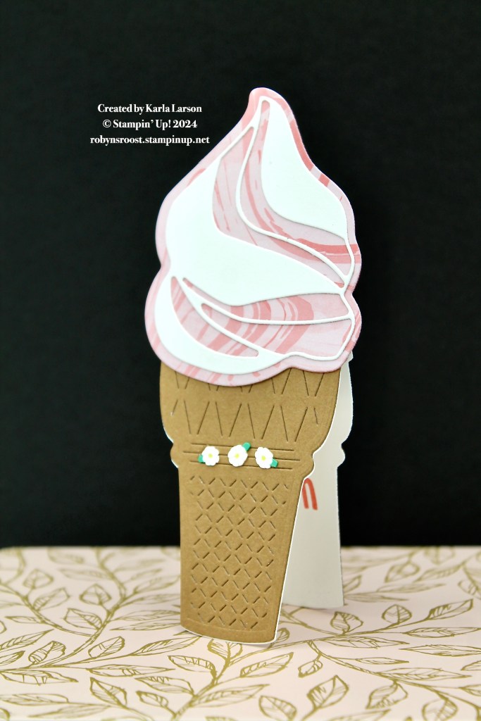 Karla’s card is a cute shaped card that would also make a really sweet gift tag. The base is cut with the large die from the Ice Cream Swirl Dies, that cuts out a card base in the shape of a cone. There is even a score line for folding. Next, a Pecan Pie layer was cut with the die that also embosses all the details onto the cone. The ice cream is created with 3 layers. A Calypso Coral base with the outline die, then a layer of Most Adored Specialty Designer Series paper cut with the same die. Finally a Basic White layer cut with the swirl die. Three of the Loose Daisy Embellishments finish off the card.