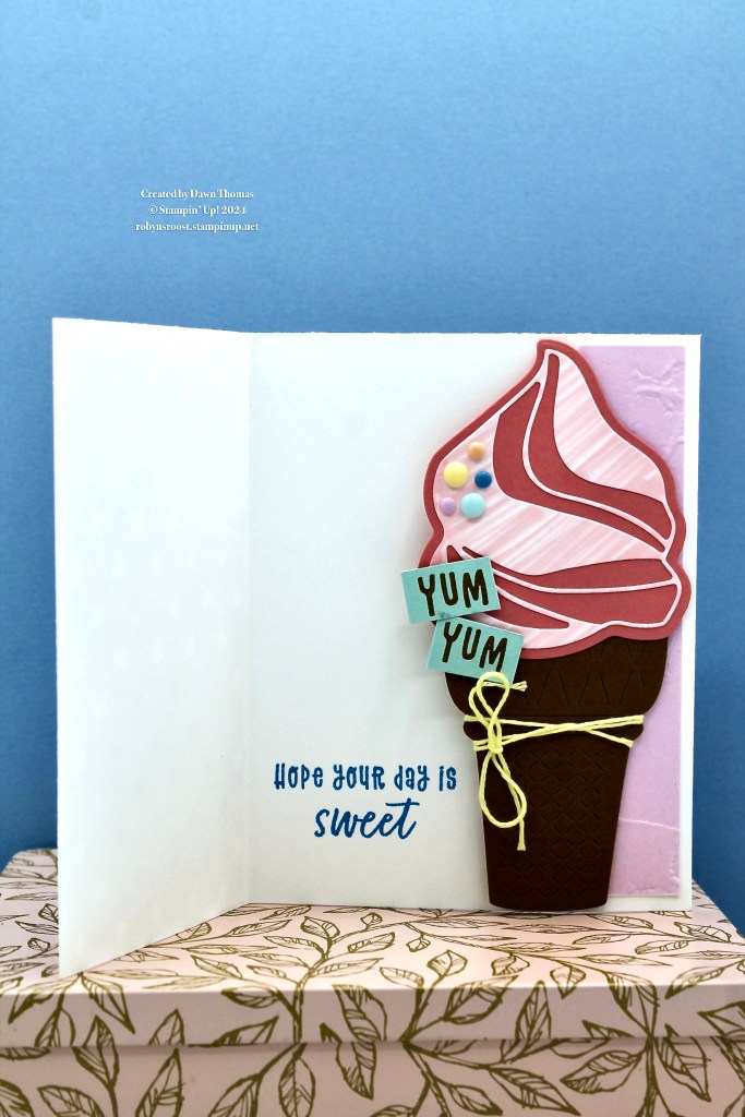 Dawn’s card is a fun fold, with the cone being a latch to hold the card closed. To open the card, fold the edges back slightly to pop up the center.
