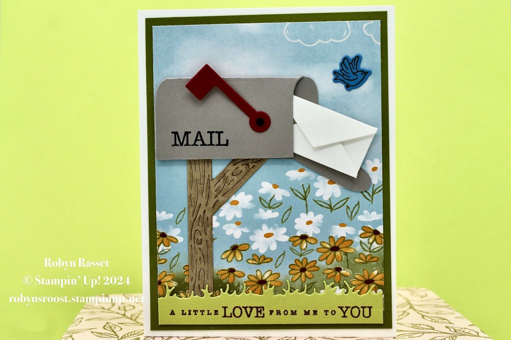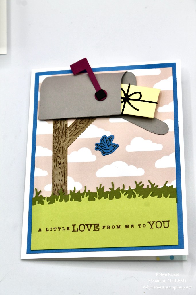 Here is the card that I did on the video. It has a piece of the Rain or Shine Designer Series Paper for a background. You can see how the envelope in the mailbox folds on this card. I left off the bow die cut so that the folded envelope showed. The flag attaches with a brad and will actually raise and lower. Did you notice the layers of green on the bottom of the cards? The die cuts the grass sprigs only. Not the bottom or the ends, which gives lots of opportunity to use it in different ways. Make a longer piece, or by using different widths of paper, more or less grass.