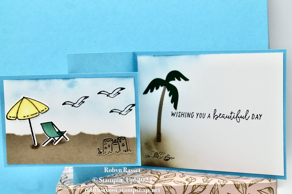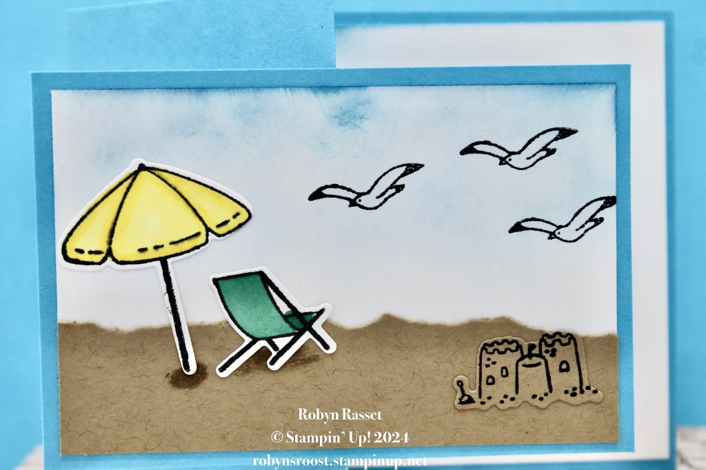 The umbrella and chair are colored with Stampin’ Blend Markers. The sandcastle is stamped on Crumb Cake. all three pieces are die cut with the matching Beach Day Dies. The sand is a 1″ x 4 1/4″ piece of Crumb Cake paper with one edge torn. A little bit of Crumb Cake ink was added with a Q-Tip under the umbrella and chair. The sky was colored with Tahitian Tide ink using a Blending Brush.