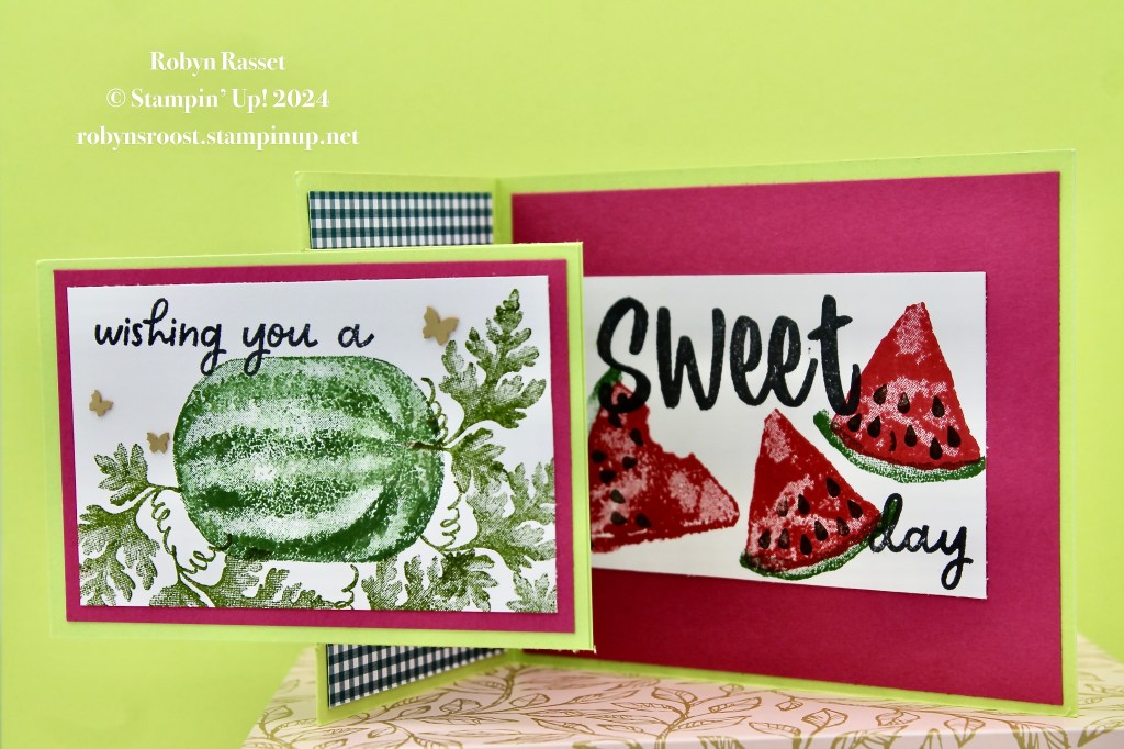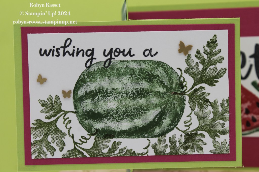 The watermelon slices are done with 4 different stamps, one has a bite out of it, the rind is a separate stamp as are the seeds.