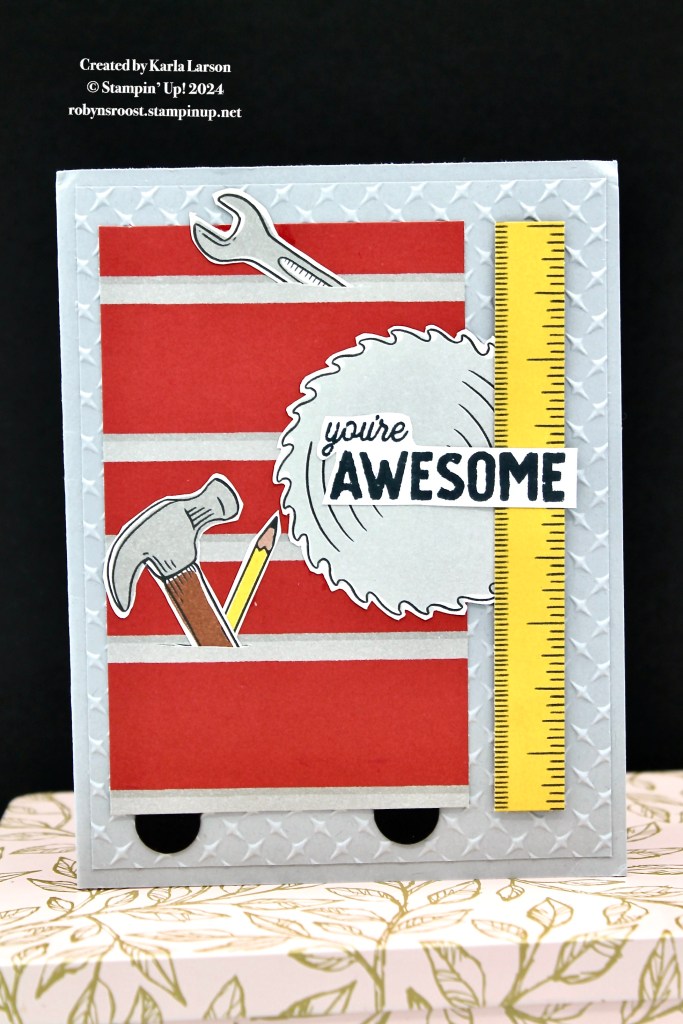 Let’s start with a tool box created by Karla Larson. This fun card was created mostly with the free Trusty Toolbox Designer Series Paper! Karla has taken a partial greeting from the coordinating Trusty Tools stamp set. The tools, ruler, and pencil are all fussy cut from the DSP. I love how she cut a slit in the “toolbox” drawer for the tools to slide into, making it look like the drawer is partially open. The background is embossed with the Metal Plate Embossing Folder for a real garage feel. The toolbox is even on wheels!