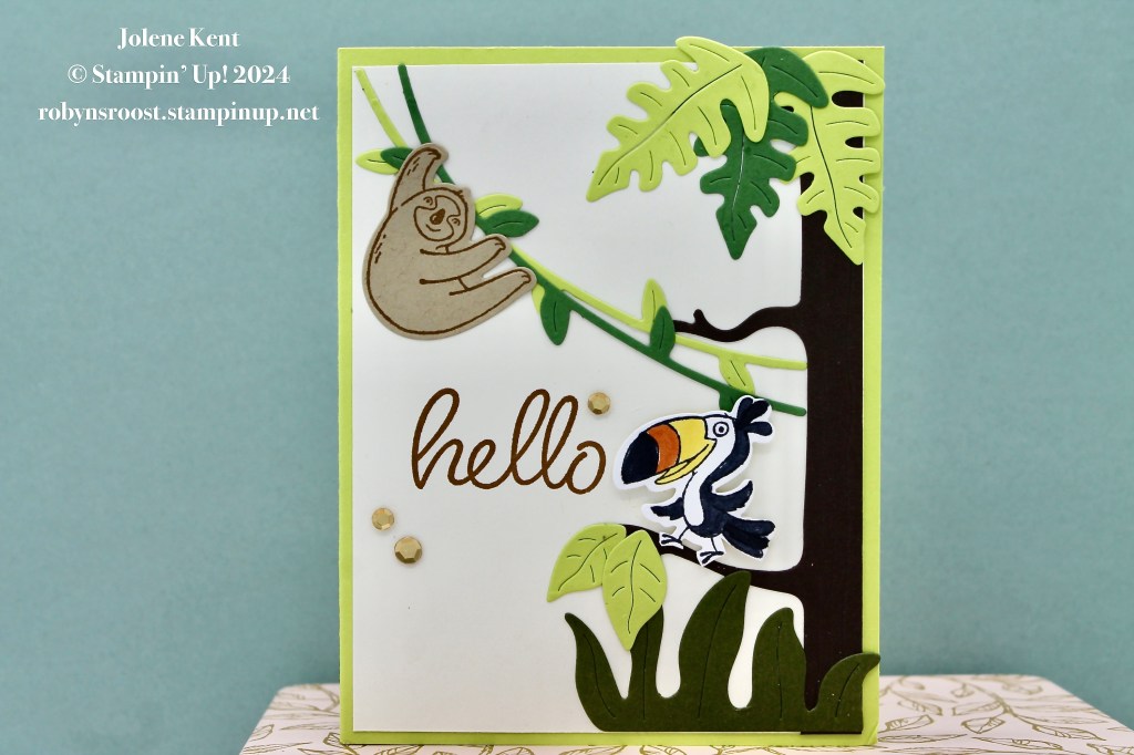 My next card is by Jolene Kent and features three FREE Sale-a-bration items. The Jungle Pals stamp set is free with a $50 order and the coordinating Jungle Pals Dies is free with a $100 order and when paired together make an awesome bundle. The greeting is from the Heartfelt Hellos stamp set free with a $50 order.