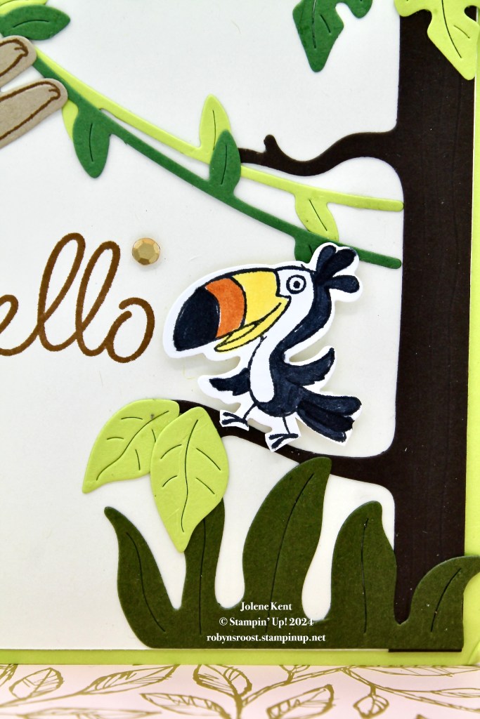 While the toucan is colored with Stampin’ Blend Markers. Also, notice how she has a variety of green papers to create a rich jungle look. I love it!