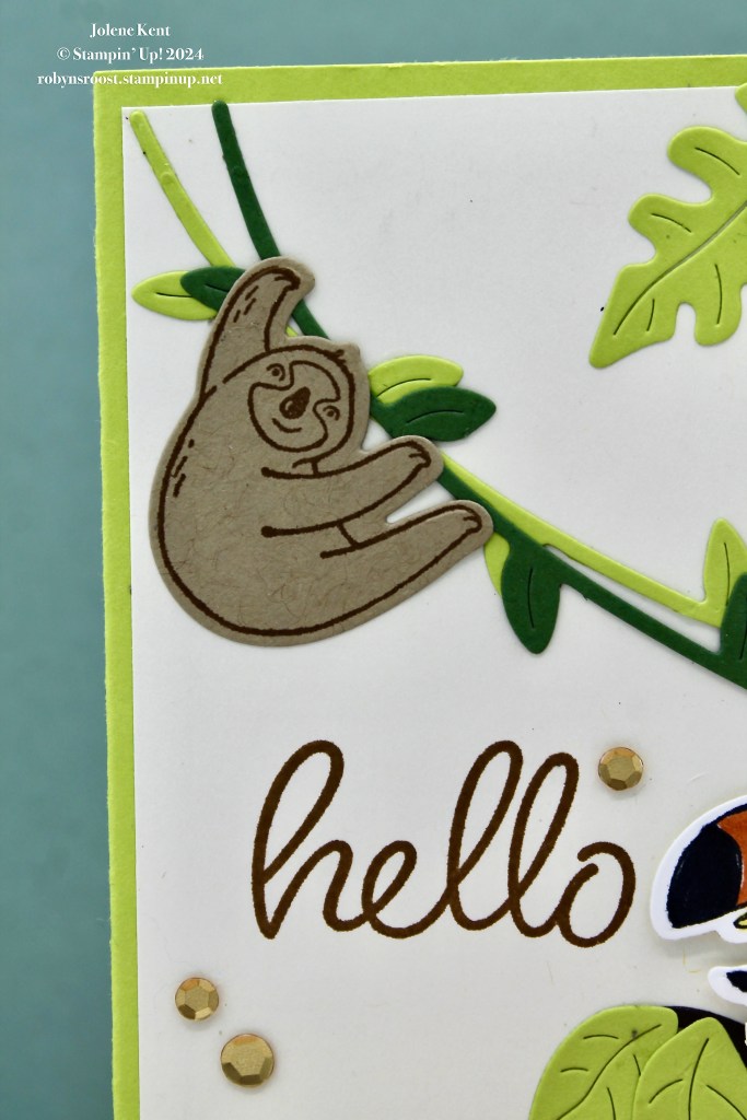 I like the way that Jolene has combined two different ways to use the stamps and dies. The sloth is stamped on colored cardstock and cut out.