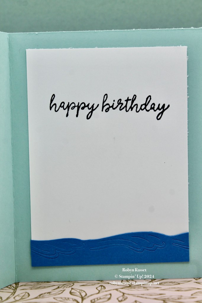 The inside of the card, has another die cut, some waves, cut from Azure Afternoon paper. To make white caps, remove the narrow cut outs.
