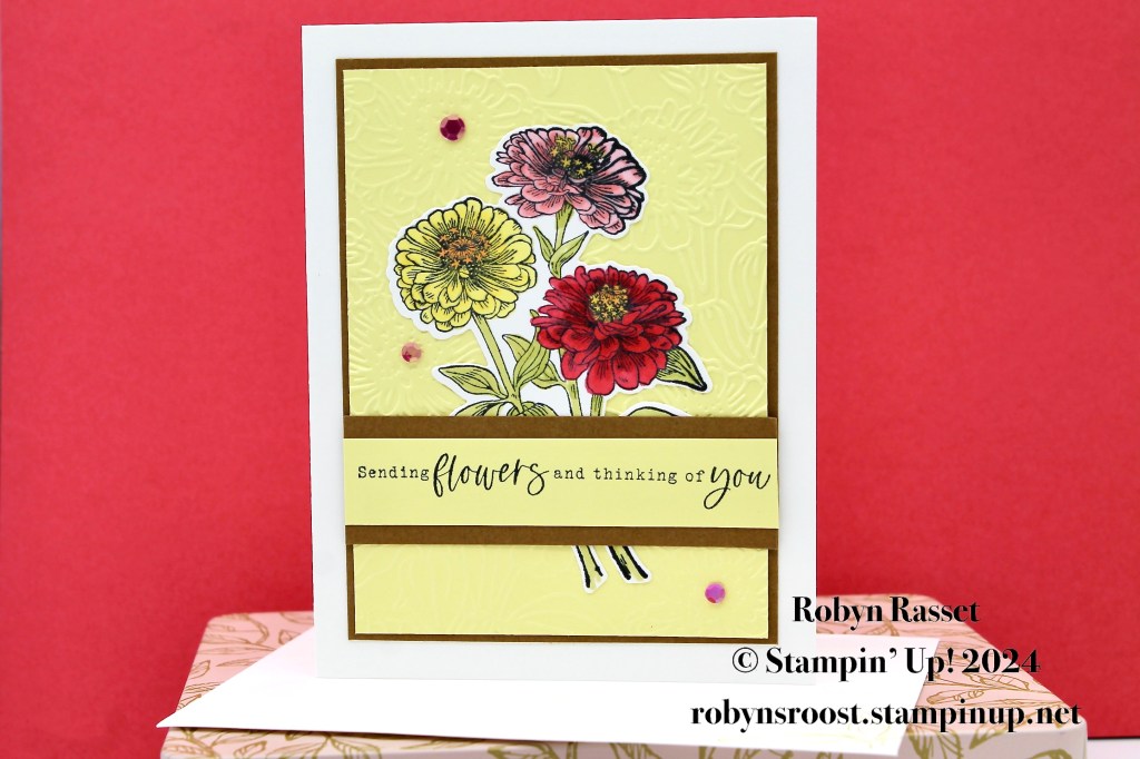 My first card uses the THIS color combo of Sweet Sorbet, Flirty Flamingo, Pumpkin Pie and Lemon Lolly. I did pull in some Pecan Pie and Basic White neutrals to complete the card as well as a Light Old Olive Stampin’ Blend for the stems. Can you see the embossing on the Lemon Lolly layers? That’s the Zinnia 3D Embossing Folder in action. The sequins are also part of the Suite.