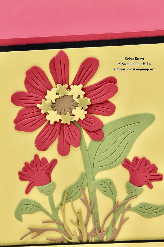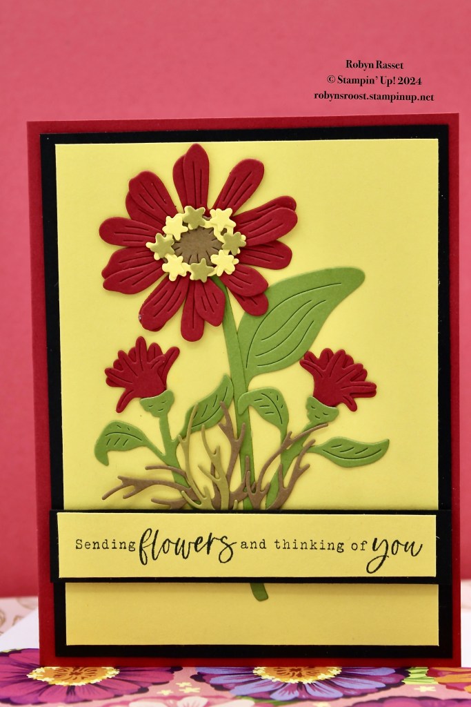 Card one is done in Basic Black, Delightful Daffodil, and Real Red with Old Olive leaves and Pecan Pie and Wild Wheat twigs. The only stamping on the front of the card is the greeting from the matching Simply Zinnia stamp set.