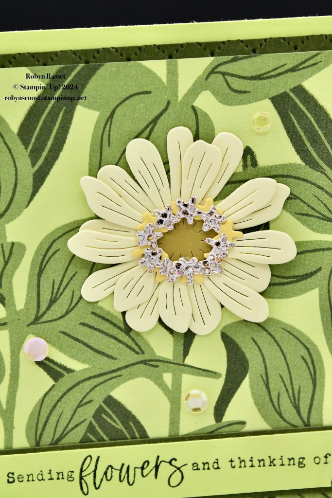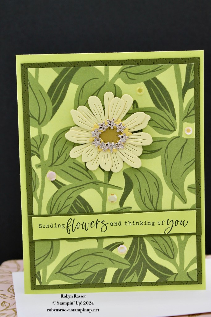 Card two adds a piece of the Flowering Zinnia Designer Series Paper. The colors on this card are Lemon Lolly, Mossy Meadow, Daffodil Delight, Parakeet Party, Pecan Pie and that fun More Dazzle Glimmer paper.