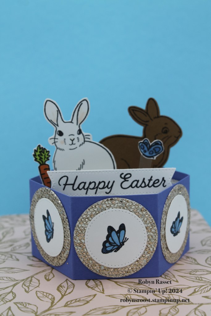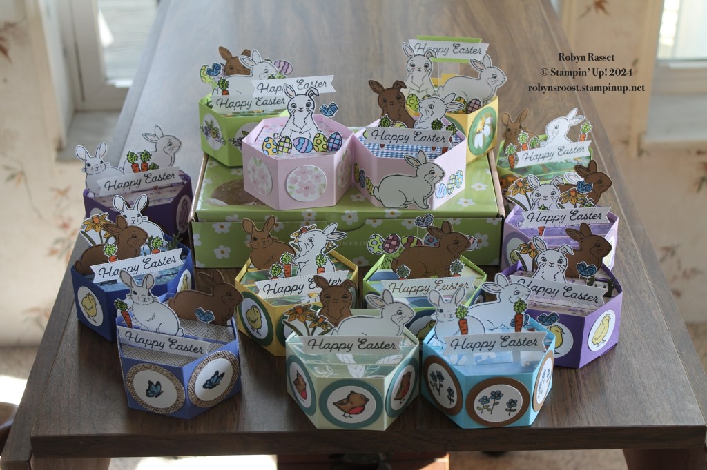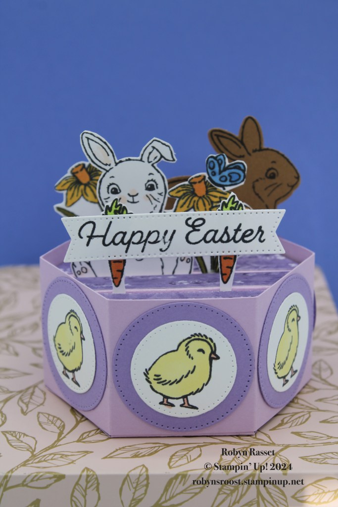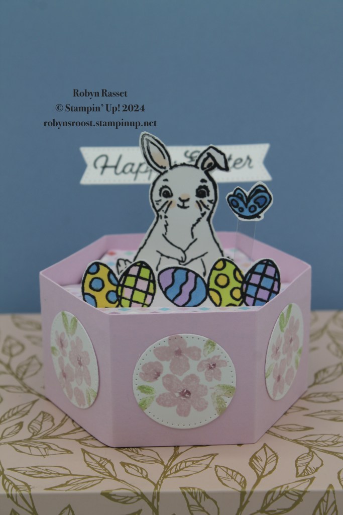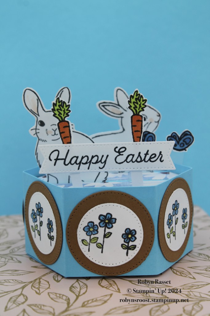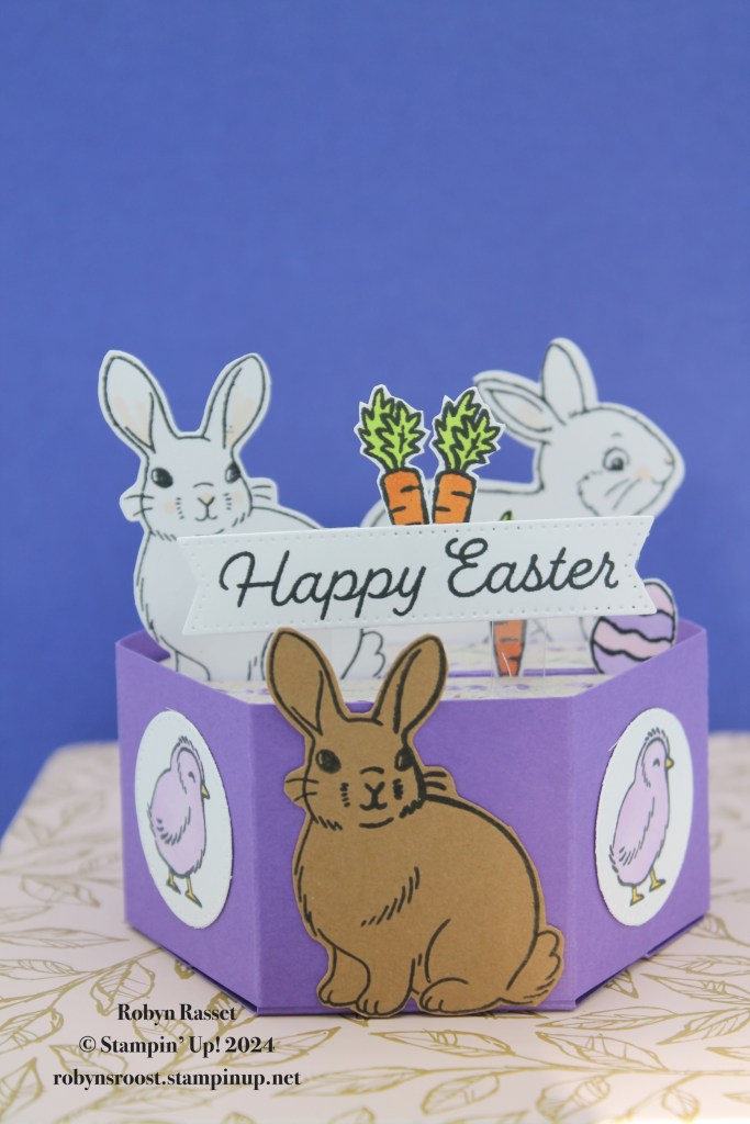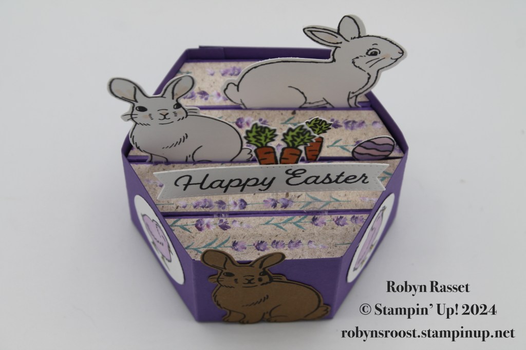 I used a variety of colors and images but mostly the Easter Bunny stamp set and Bunny Punch along with the stamp set from the Sweet Springtime Paper Pumpkin Kit. The hardest part of this card is making the base. I’ve done a video tutorial for those of you who want to tackle one of these Hexagon Pop Up’s.
