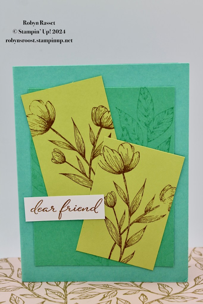 This is the only card that I actually competed at the event. It has a Summer Splash base, Shy Shamrock layer, and Lemon Lime Twist panels. The ink is Pecan Pie and Shy Shamrock.
