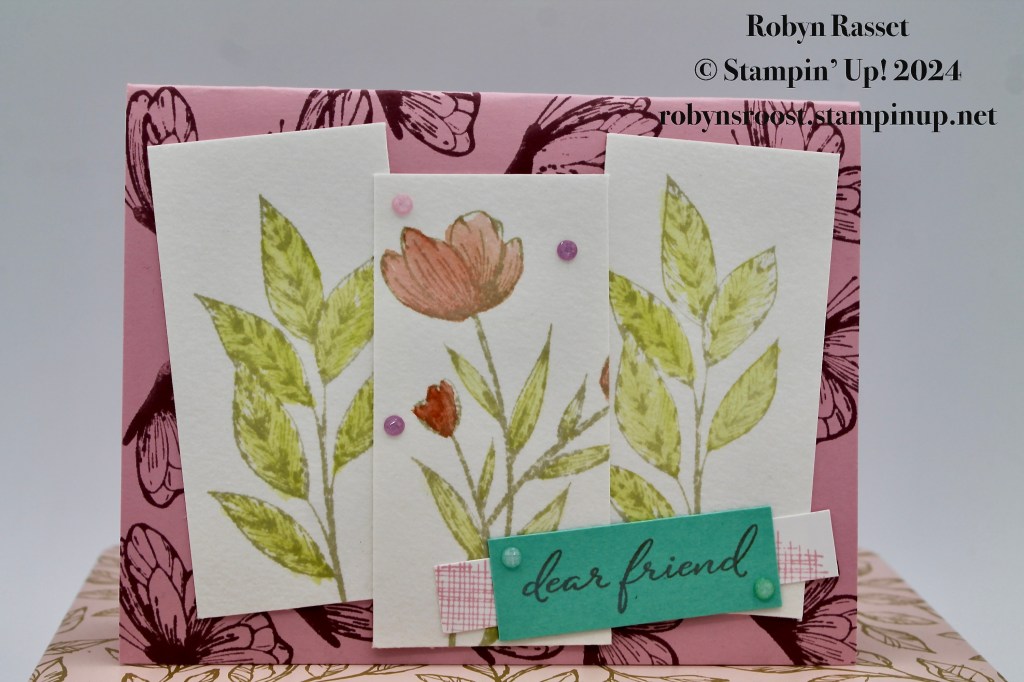 The panels on this card are done on Watercolor Paper and I did complete the panels at the event, but had to guess where to place them on the 5″ x 7″ Watercolor paper and then cut them once I got home. Luckily, I did good. The butterflies on the Pretty In Pink card base were stamped at home with Berry Bliss ink.
