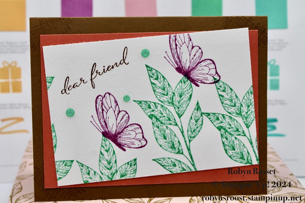 I did get most of the stamping done at the event so that I could use the new In-Color inks, and then finished the cards once I returned home. This card uses the Petunia Pop for the butterflies and Shy Shamrock for the leaves. The greeting was done once I got home and is Pecan Pie.