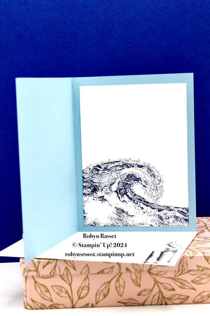 For the inside, a wave was stamped on the bottom with Blueberry Bushel ink. A pelican was added to the corner of the envelope.
